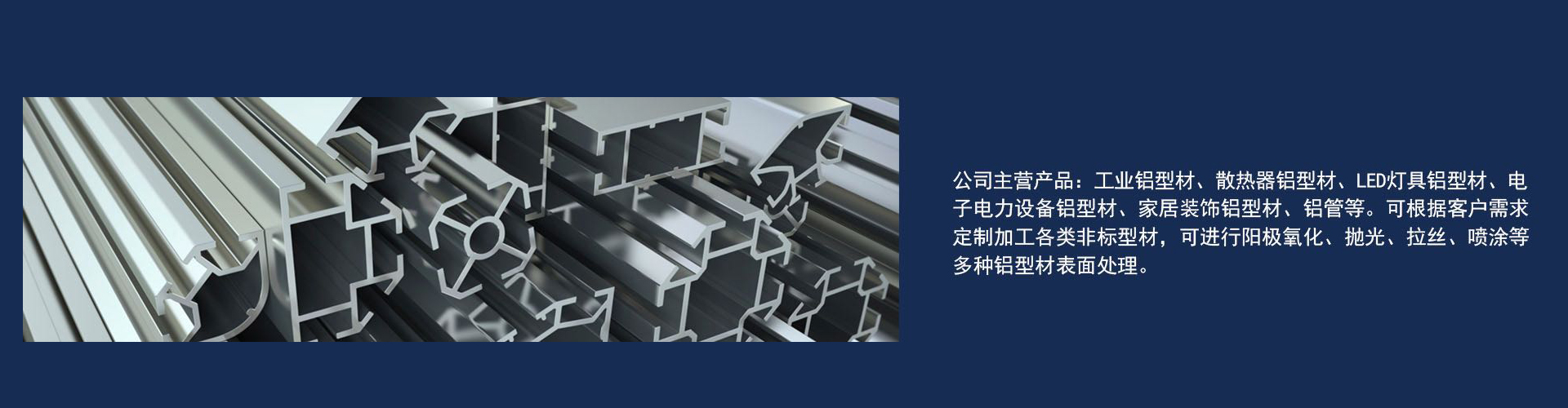 我公司主营业务主要包括:铝管加工、工业铝型材加工、机械设备铝型材加工、散热器铝型材加工、LED型材加工、家居用品铝型材加工等;我公司生产的铝材产品有吊轨、装饰铝型材、工业流水线铝型材、太阳能边框支架、方管、圆管、椭圆管、工业铝型材、散热器、遮阳棚伸缩杆铝型材、电梯门导轨铝型材、落地画框铝型材、梯子铝型材等。